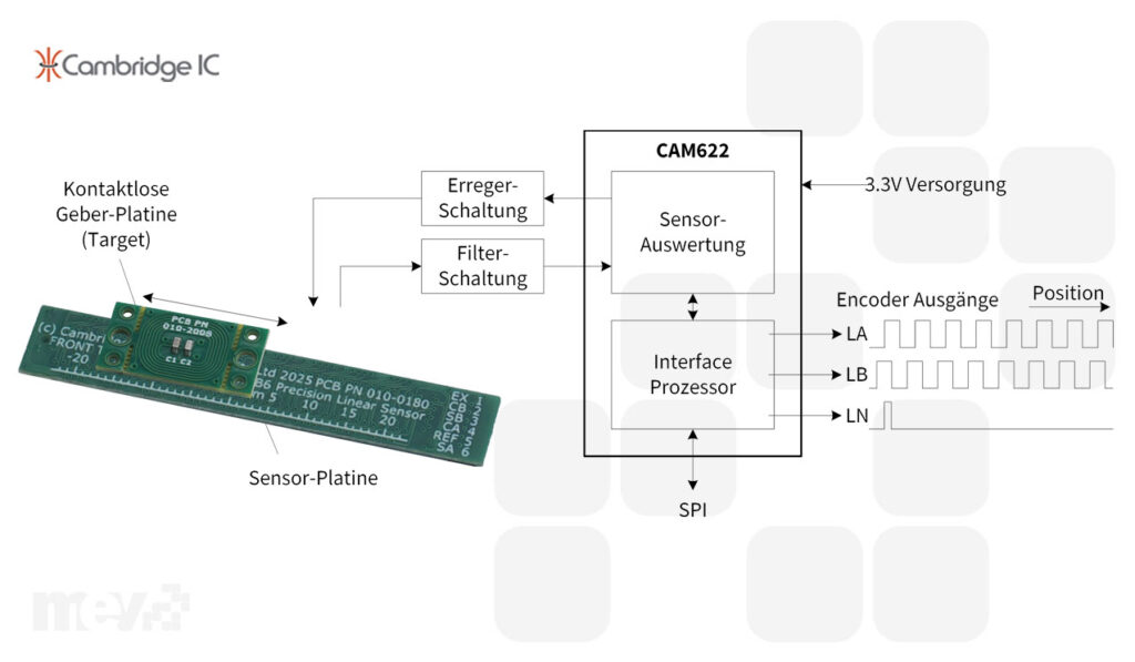 Die Signalverarbeitung der Linearsensoren Typ B erfolgt durch den resonanten induktiven Positionsgeber-IC CAM622 von CambridgeIC. CAM622 bietet: